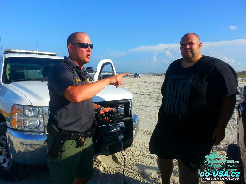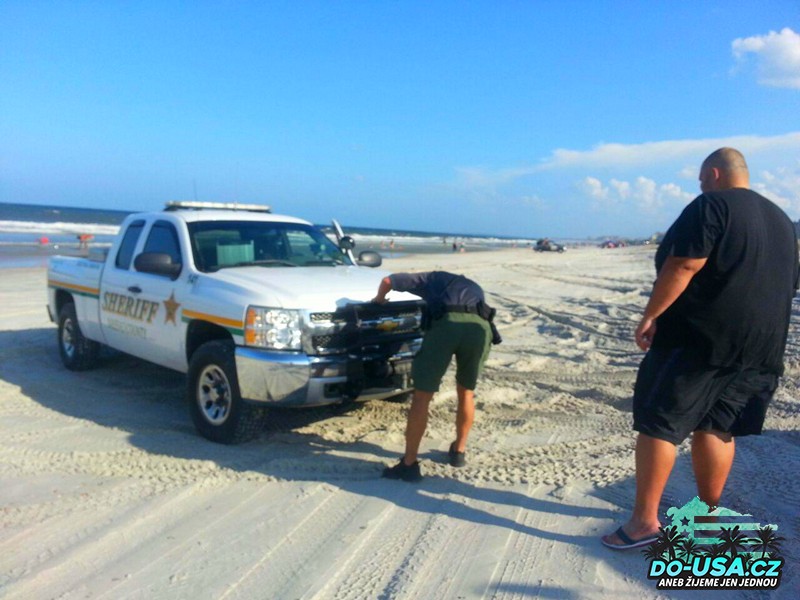 Všiml si nás šerif, kterej jel kolem, vůbec se ničemu nedivil, protože jsme nebyli ten den ani první ani poslední. 🙂 Nicméně nám sdělil, že by správně neměl lidi vytahovat z písku (asi by totiž nedělal nic jinýho), ale řekl nám, že nás vytáhne. Byl hrozně milej a ochotnej. Když jsme mu děkovali, tak vypadal, že mu to přišlo až blbý, že mu tolik děkujeme. Tohle se mi tady strašně líbí. Policajti si absolutně nehrajou na nějaký drsňáky a nejsou důležití. Naopak jsou přátelští. Teda až do doby než si na ně otevřete pusu, pak se s váma už moc párat nebudou a můžete si dát klidně jednu noc za mřížema. Mají tady fakt respekt a přirozenou autoritu, a když jste v nesnázích, snaží se vám pomoct. Snaží se vám hlavně pomoct jako člověk a né že by to měl v popisu jeho práce.