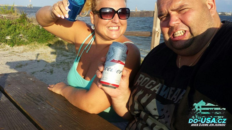 Ztratili jsme tímhle bohužel dost času, takže jsme nestihli náš piknik. Chystali jsme se totiž večer do centra Jacksonville na ohňostroj. Ani jsme nestihli jet domů se opláchnout a převlíct do čistýho oblečení. Jeli jsme rovnou z pláže, celý ulepení a od písku do centra. Po cestě jsme se zastavili na burger a dali jsme si „Beer Shotgun Challenge“. Dělali jsme to poprvé, takže to ani tak nebyla challenge spíš jak obrovská sranda, kdy jsem nemohla zastavit smích a krkání z piva. Jde vlastně o to, že máte pivo v plechovce a něco ostrýho, čím tu plechovku ve spod probodnete a tou dírou to pivo musíte vypít.