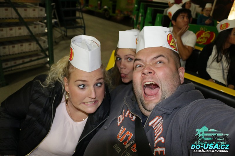 Když jsme přijeli a vešli do toho návštěvního centra, měla jsem pocit, jako bych byla v nějaké pohádce pro děti. Všechno bylo barevný, veselý a takový roztomilý. Přijeli jsme akorát, protože svolávali lidi na tu prohlídku vláčkem. Ta prohlídka byla ZADARMO – věta, na kterou Češi moc dobře slyší. 🙂 Ještě jsme dostali takový papírový čepičky Jelly Belly. Ve finále z nás vlastně udělali tutany s čepičkama, co jedou vláčkem a tleskají, ale já jsem si to hrozně užila. Bylo mi jedno, že vypadám jak idiot, ono vlastně tam vypadali jak idioti úplně všichni. 😀